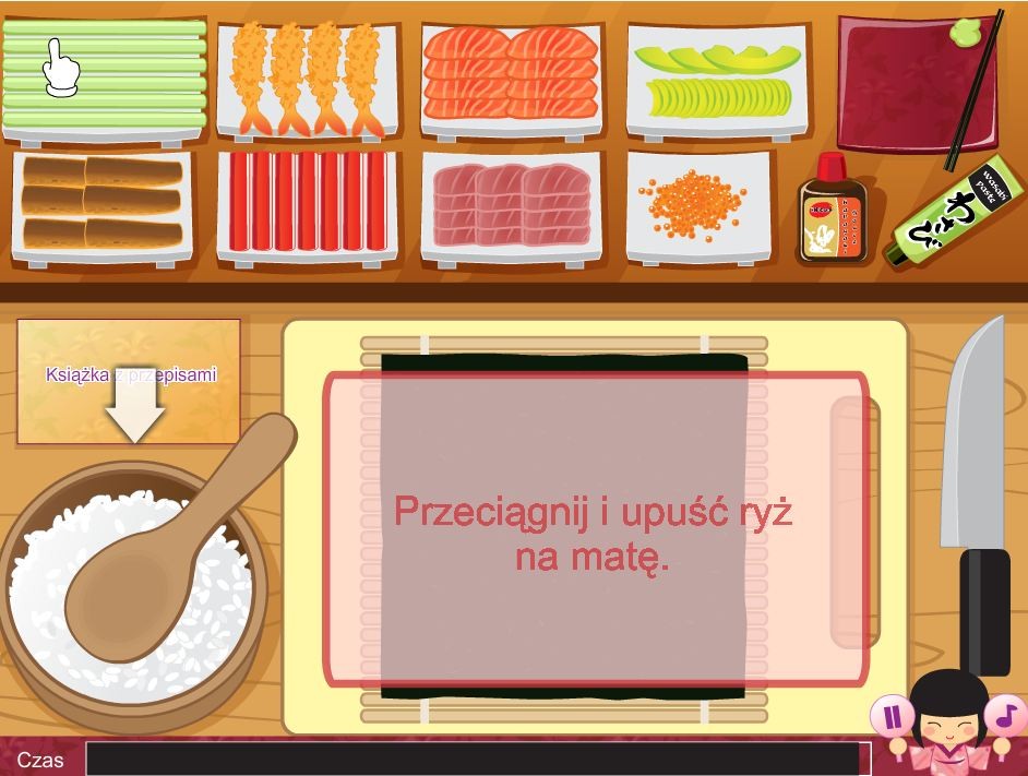 Naszym zadaniem jest przygotować sushi. Musimy postępować zgodnie z instrukcjami na ekranie, by stworzyć miłe dla oka i smakowite danie.