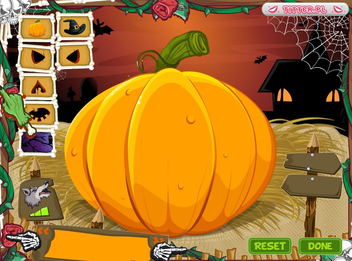 Zadanie polega na przygotowaniu halloweenowej dyni. Dobierz właściwy okaz i wytnij odpowiednio wszelkie otwory oraz dobierz niezbędne ozdoby.