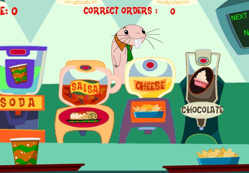 Naszym zadaniem jest dodanie składnika z odpowiedniej maszyny do przemieszczającego się naczynia z potrawą.