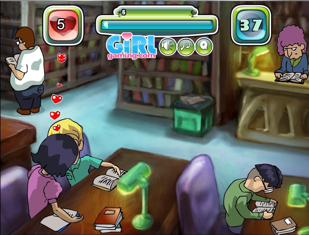 Dwoje zakochanych wybrało się do biblioteki. Naszła ich ochota na całowanie. Umożliw im to chroniąc przed utrudniającymi czynnikami.