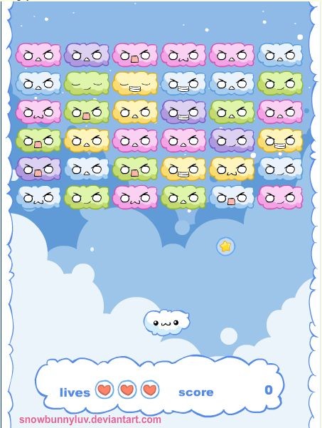 Popularna gra Arkanoid w formie chmurek. Naszym zadaniem jest odbijanie piłki i zbijanie kolorowych chmurek wiszących w powietrzu.