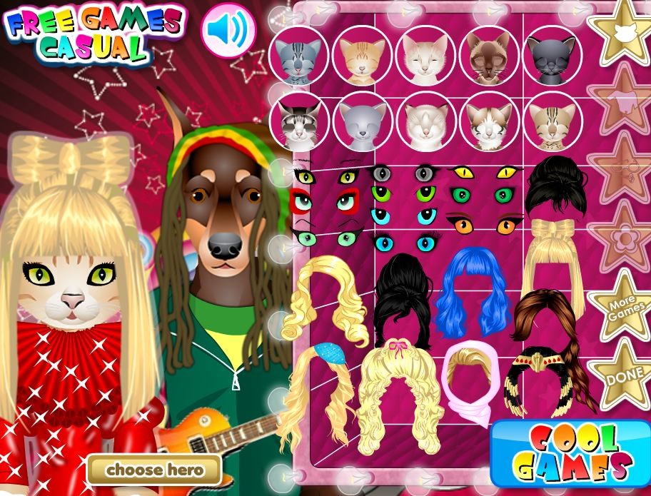 Zwierzaki, jak i ludzie również uwielbiają zmieniać swój wygląd. Te zwierzaki zapragnęły dużej rockowej zmiany. Pomóż im tego dokonać wybierz dla nich typowo rockowe ozdoby, by wyglądały cool!