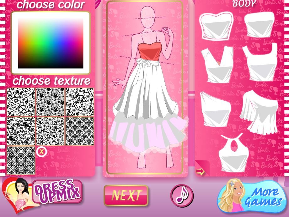Zabaw się w projektanta mody i zaprojektuj świetną sukienkę dla Barbie! Laleczka bardzo potrzebuje piękniej sukni na specjalne wyjścia. Teraz Twoja rola, do dzieła!
