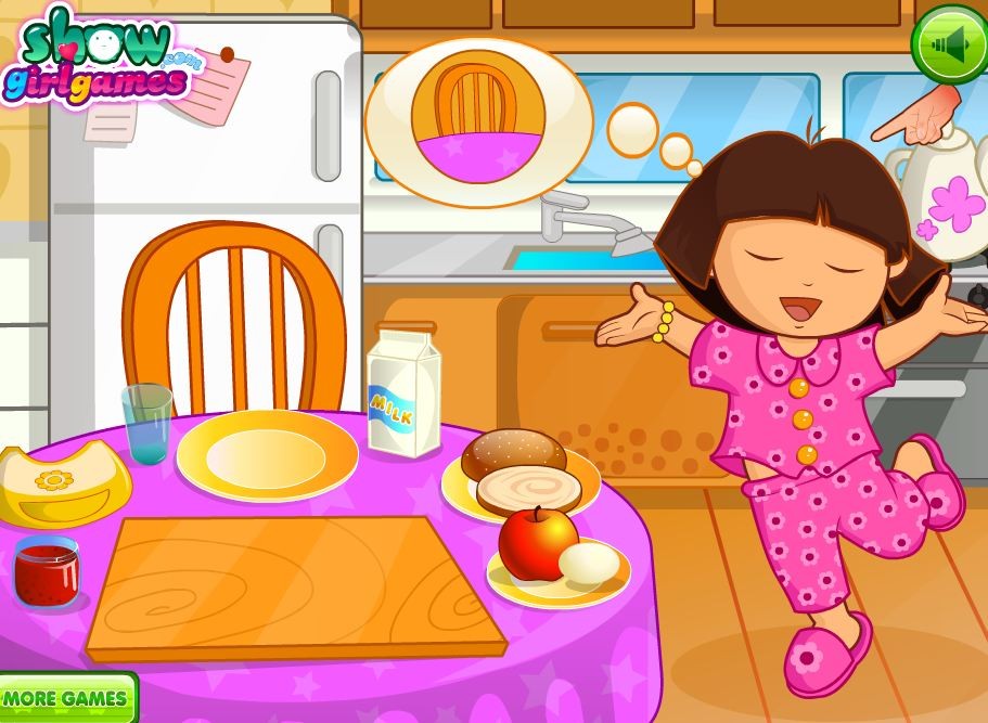 Dora nigdy nie zapomina o śniadaniu, dziś jej mama jest w pracy i nie może przygotować jej posiłku, dlatego Ty wciel się w tą rolę i nakarm małą dziewczynkę!