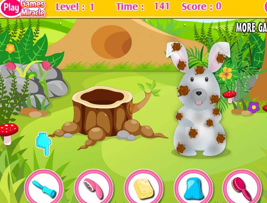 Słodki królik narozrabiał i wrócił do domu caaały brudny! Koniecznie trzeba go umyć, zanim zjawi sie jego mama. Pomóż mu w tym.. Zapewnij mu kąpiel, dzięki której znów będzie czyściutki!