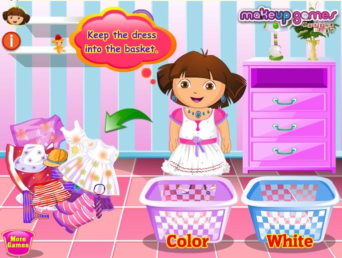 Mała Dora musi zrobić dziś wielkie pranie! Dziewczynka obawia się, że nie poradzi sobie sama z tym zadaniem, dlatego zaproponuj jej swoja pomóc. Posegregujcie ubrania kolorystycznie i zacznijcie wielkie pranie!