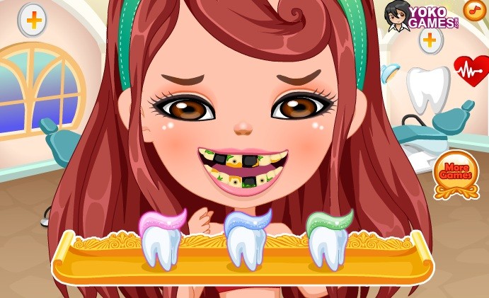 Na pomoc zębom! Dziewczynka nie słuchała zaleceń dentysty i bez oporu jadła czekolade, w efekcie wylądowała na fotelu dentystycznym z wielkim bólem zębów. Spróbuj uśmieżyć jej ból i wylecz jej zęby!