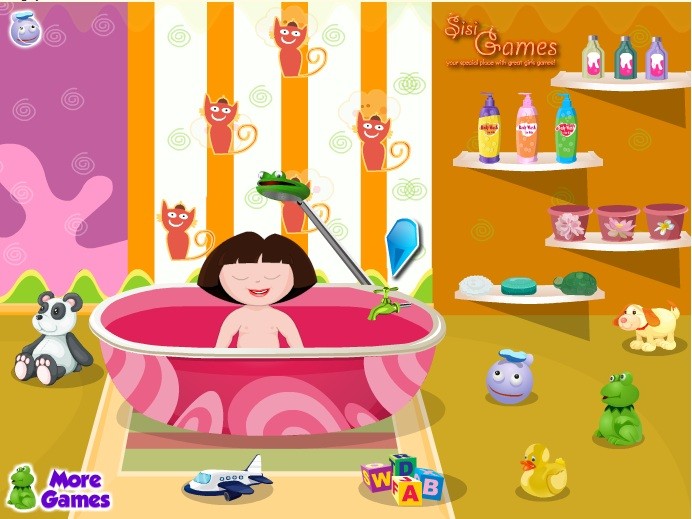 Dora nie mogła dziś zaopiekowac się swoim dzieckiem, dlatego prosi Ciebie o pomoc. Zajmij się jej córeczką, spędź z nią torchę czasu. Wykąp maluszka, ubierz, nakarm i zabawiaj, by nie płakał.