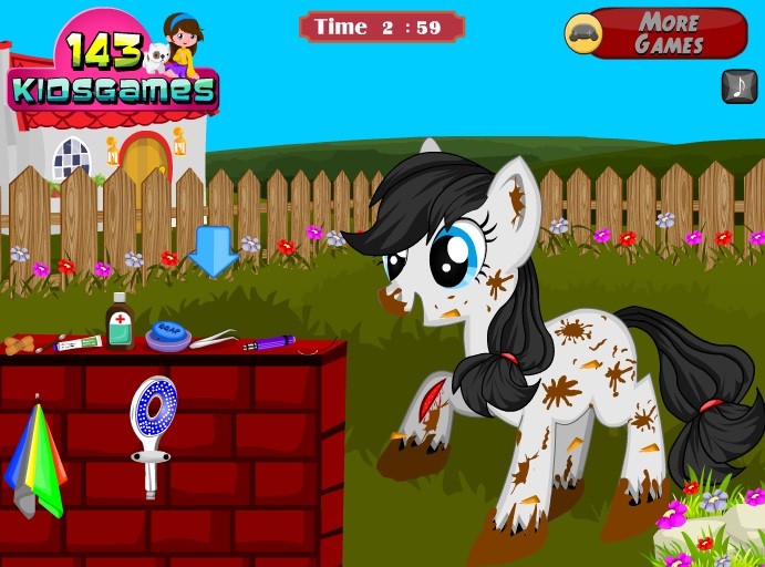 Konik miał mały wypadek, przez co jest zupełnie brudny i trochę poraniony. Zabierz go do siebie i pomóż mu! Porządnie go umyj, by znowu był czysty i opatrz jego rany.