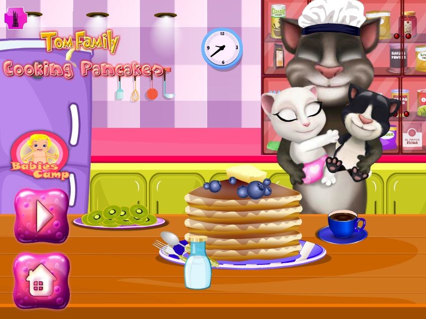 Tom oglądał telewizję, gdzie przygotowany pyszne naleśniki. Podekscytowany Tom zdecydował, że przygotuje takie same pyszności dla swoich kociaków! Pomożesz przygotować obiad?