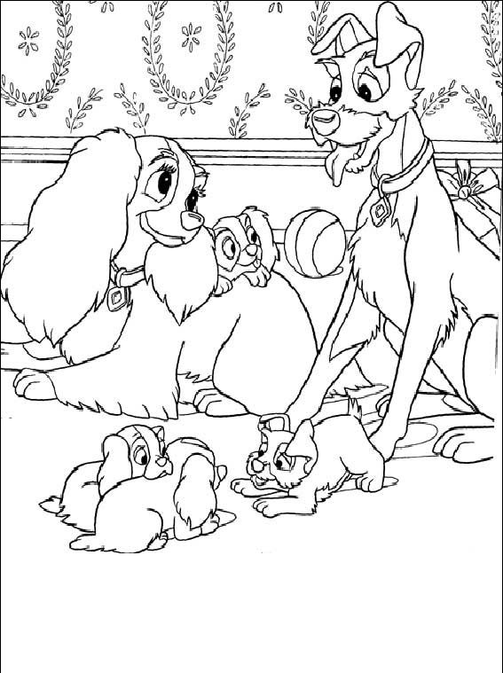 Tramp i Lady wraz ze swoją rodziną, maję oni ładne szczeniaczki, pokoloruj obrazek i policz ile ich jest.