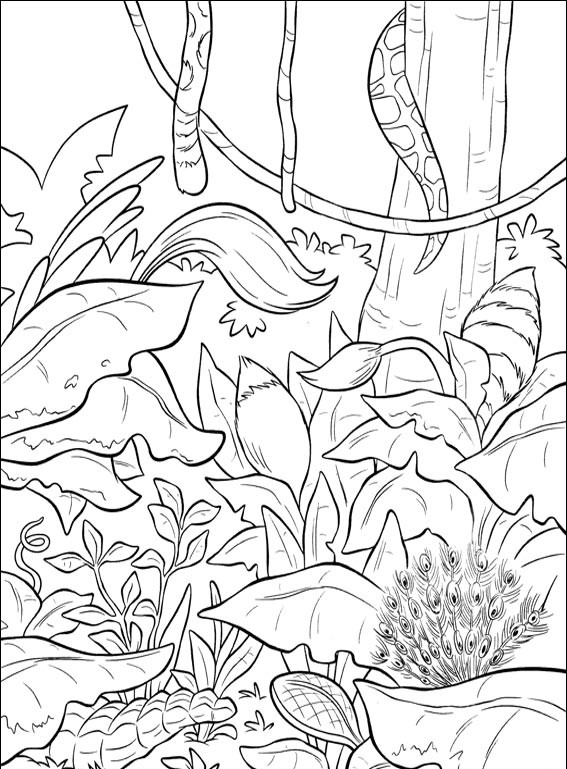 Krajobraz dżungli jest bardzo piękny, pokoloruj obrazek i zobacz czy widzisz jakieś zwierze.