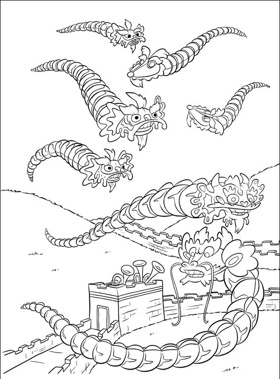 Dużo latających smoków na murem Chińskim,pokoloruj obrazek i policz je.