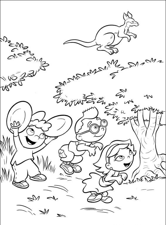 Przyjaciele są na safari i przyglądają się kangurowi który bardzo wysoko skacze,pokoloruj ich i zobacz co mają ze sobą.