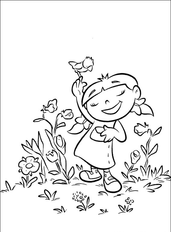 Zosia stoi wśród kwiatów i słucha śpiewu ptaszka.