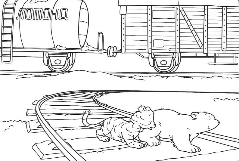 Miś wraz ze swoim kolegą przechodzi przez tory kolejowe.