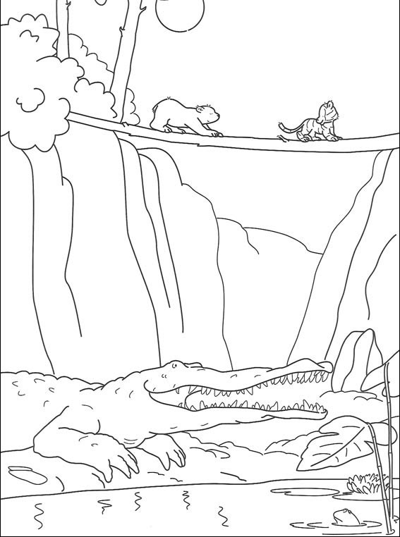 Mały miś przechodzi bardzo ostrożnie po drzewie zawieszonym nad przepaścią,pokoloruj obrazek i zobacz czy mu się uda.