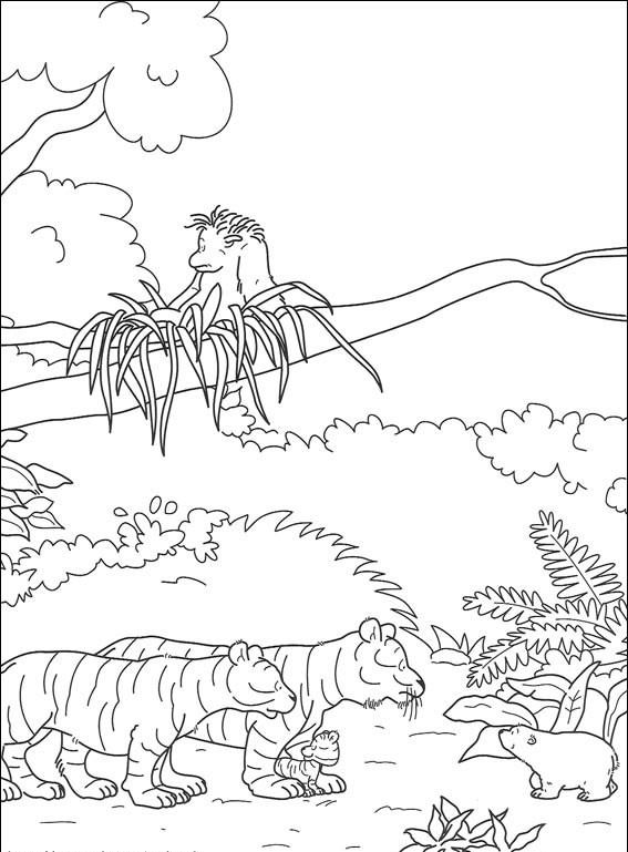 Mały miś spotyka w dżungli dwa tygrysy,pokoloruj obrazek i zobacz kto jeszcze tam jest.