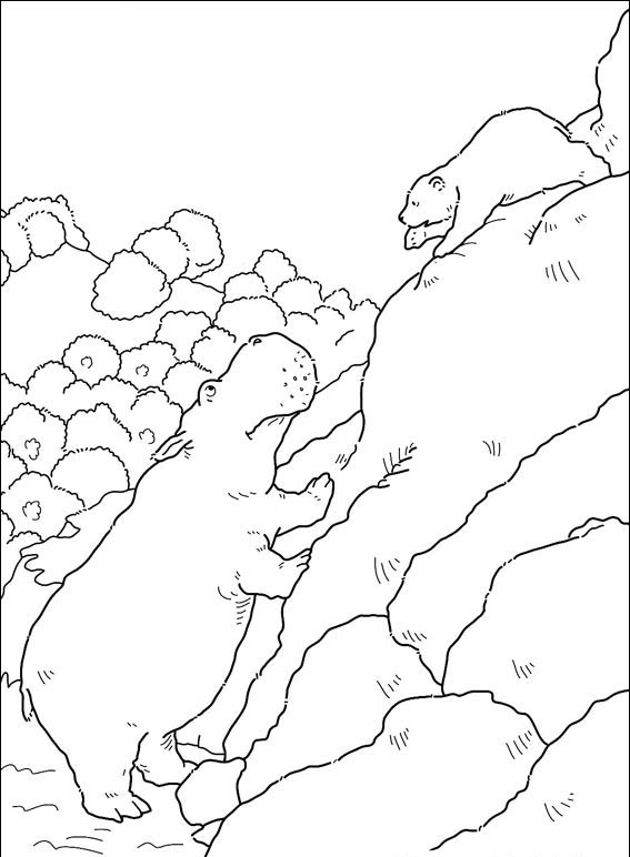 Mały miś próbuje pomóc hipopotamowi wspiąć się na góry,pokoloruj obrazek i zobacz czy się uda.