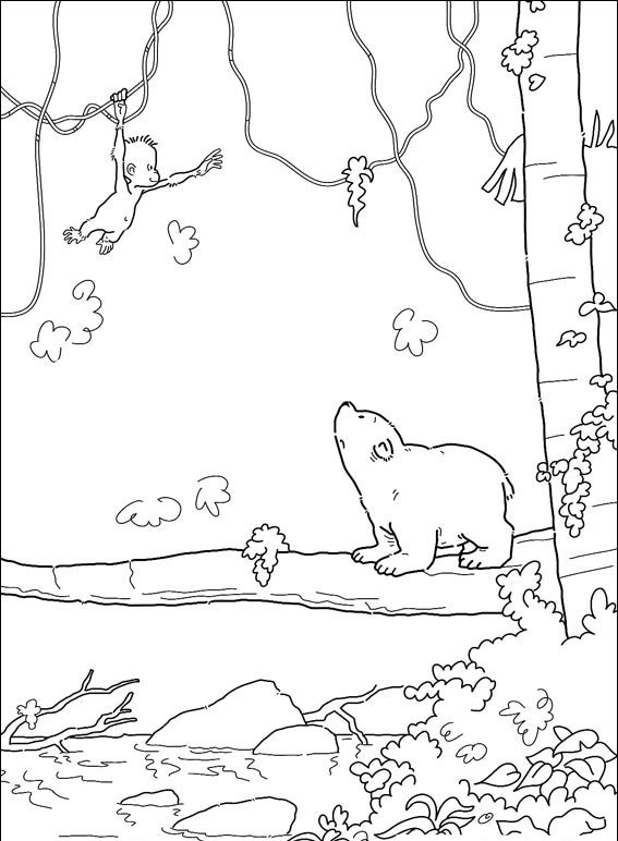 Misiek polarny przygląda się jak małpka trzyma się liany.