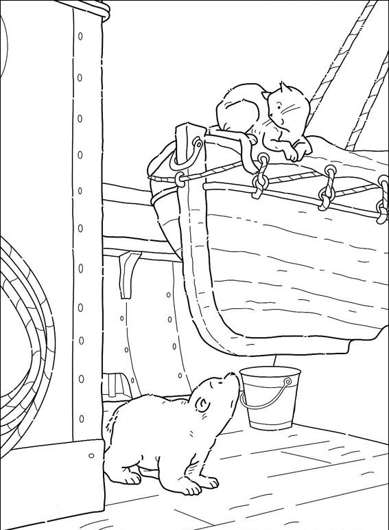 Mały miś znajduje się na statku i obserwuje kota który siedzi na szalupie.
