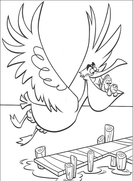 Pelikan przenosi Marlina i Dory w swoim dziobie.