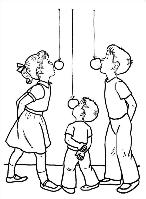 Dzieci próbują ugryźć jabłka na sznurkach.