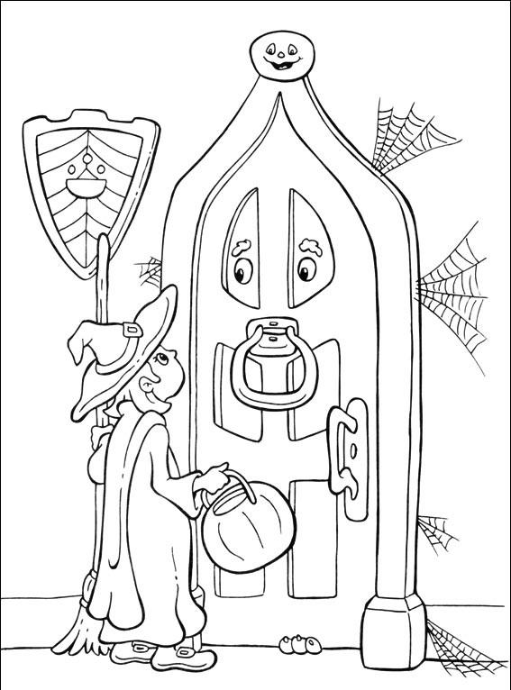 Czarownica stoi przed drzwiami.