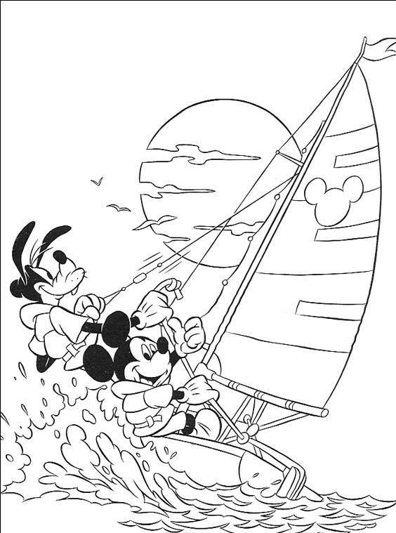 Myszka miki i Goofy płyną na żaglówce w tle zachodzącego słońca.