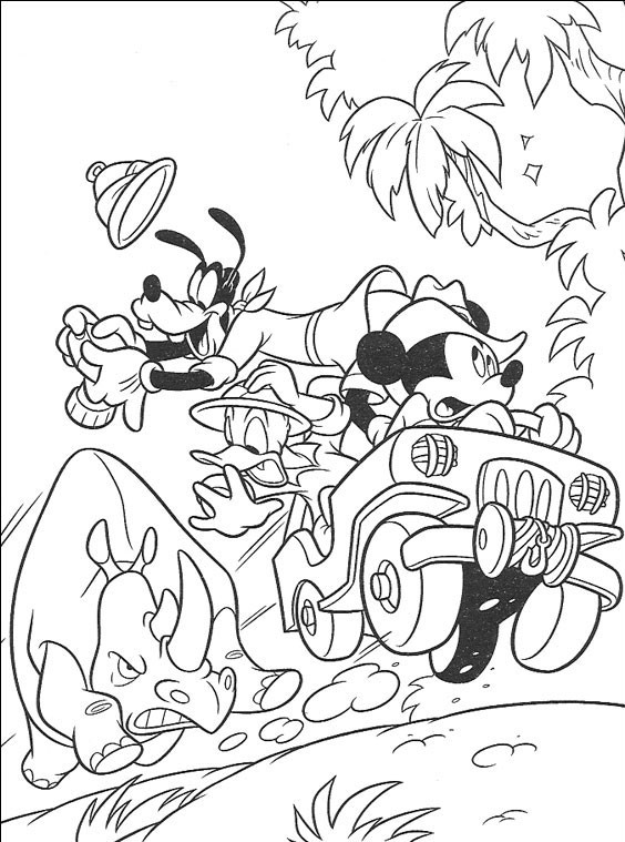 Miki kaczor Donald i Goofy uciekają samochodem przed nosorożcem.