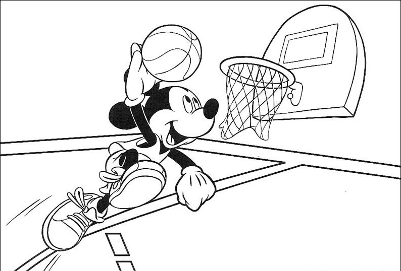 Miki wyskakuje w powietrze i rzuca piłkę do kosza.