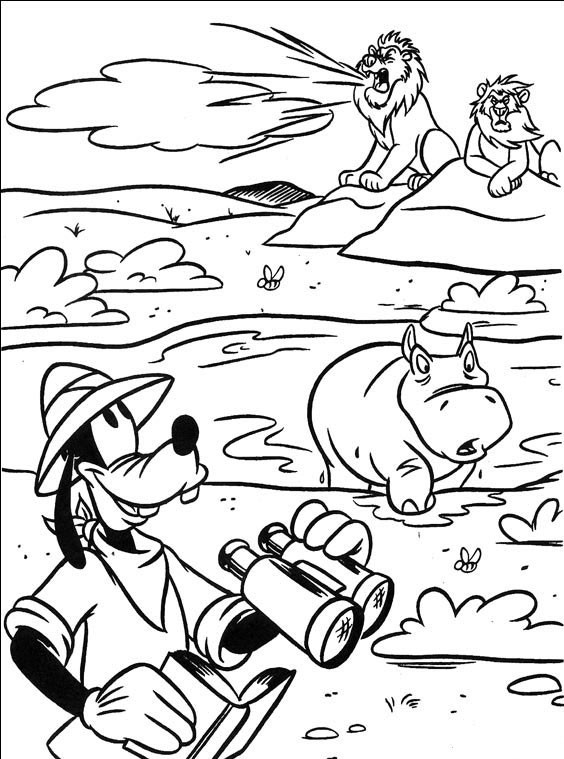 Goofy obserwuje lwa który ryczy i hipopotama który wychodzi z wody.