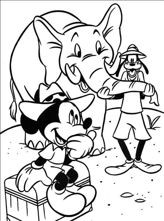 Miki obserwuje jak Goofy trzyma trąbę dużego słonia.