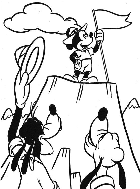 Miki wspina się na wysoką górę i wbija flagę, Goofy i Pluto przyglądają się temu.