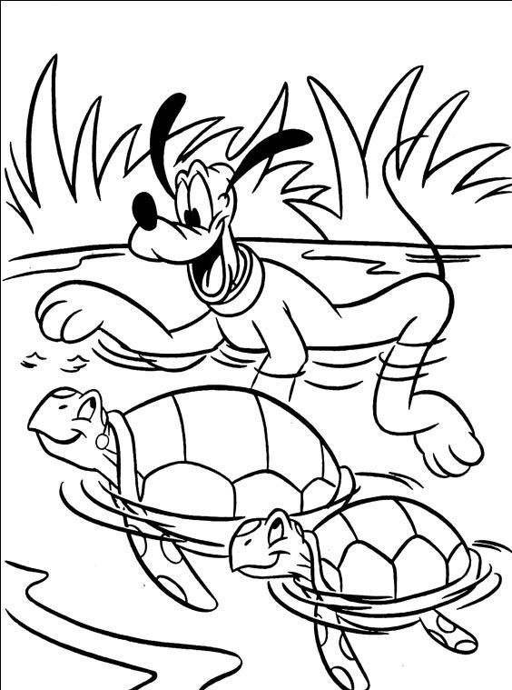 Pluto pływa razem z dwoma żółwiami w stawie.