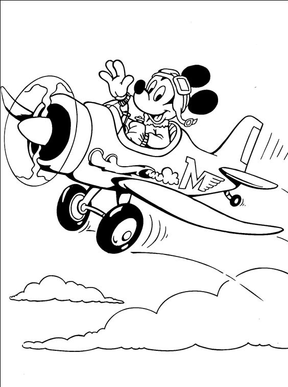 Myszka Miki leci małym samolotem między chmurami.