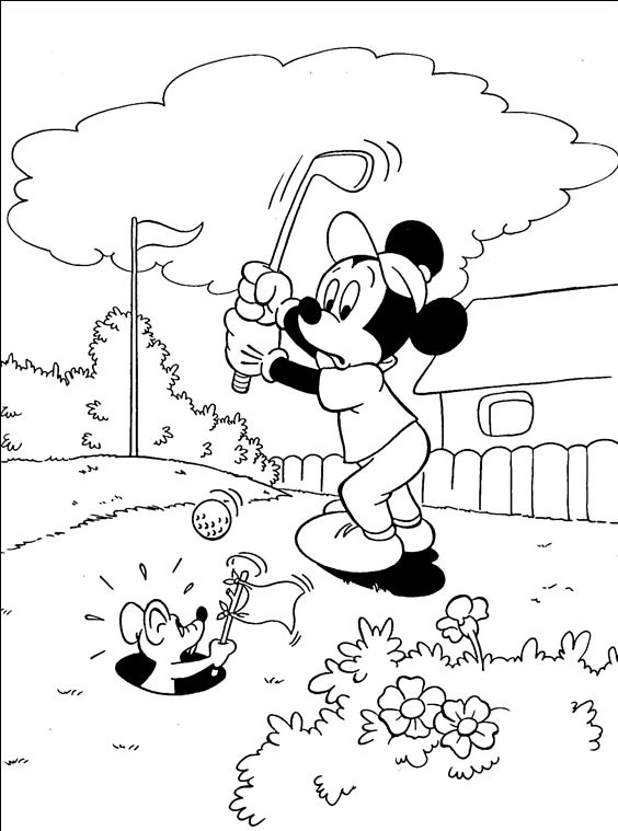 Miki uderza piłkę a z dołka wychyla się myszka i poddaje się.