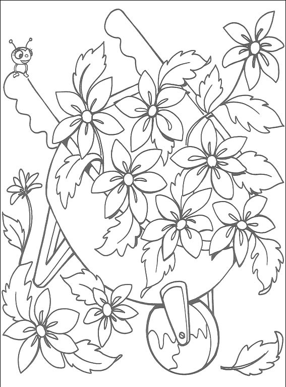 Pająk siedzi na taczce na której są bardzo ładne kwiaty.