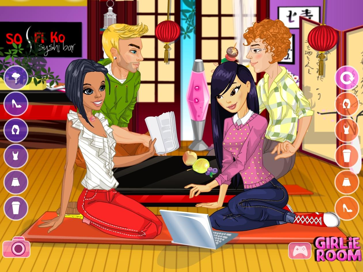 Pary postanowiły spędzić miło czas w barze Sushi. Tradycyjna japońska restauracji to idealne miejsce, by porozmawiać w spokoju i pokosztować orientalnych dań z Dalekiego Wschodu. Spróbuj dobrać zwykłe ubrania dla dziewczyn i spraw, by ten wieczór należał do udanych!