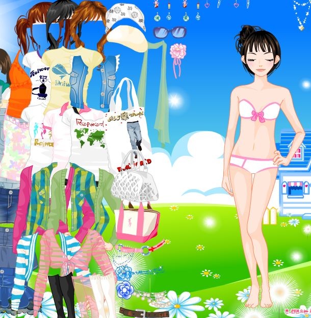 Ubieramy dziewczynę, która spędza wakacje na wsi. W tle widać kolorowy domek babci. Musimy sprawić, by ubranie dziewczyny pasowało do tamtejszego klimatu.