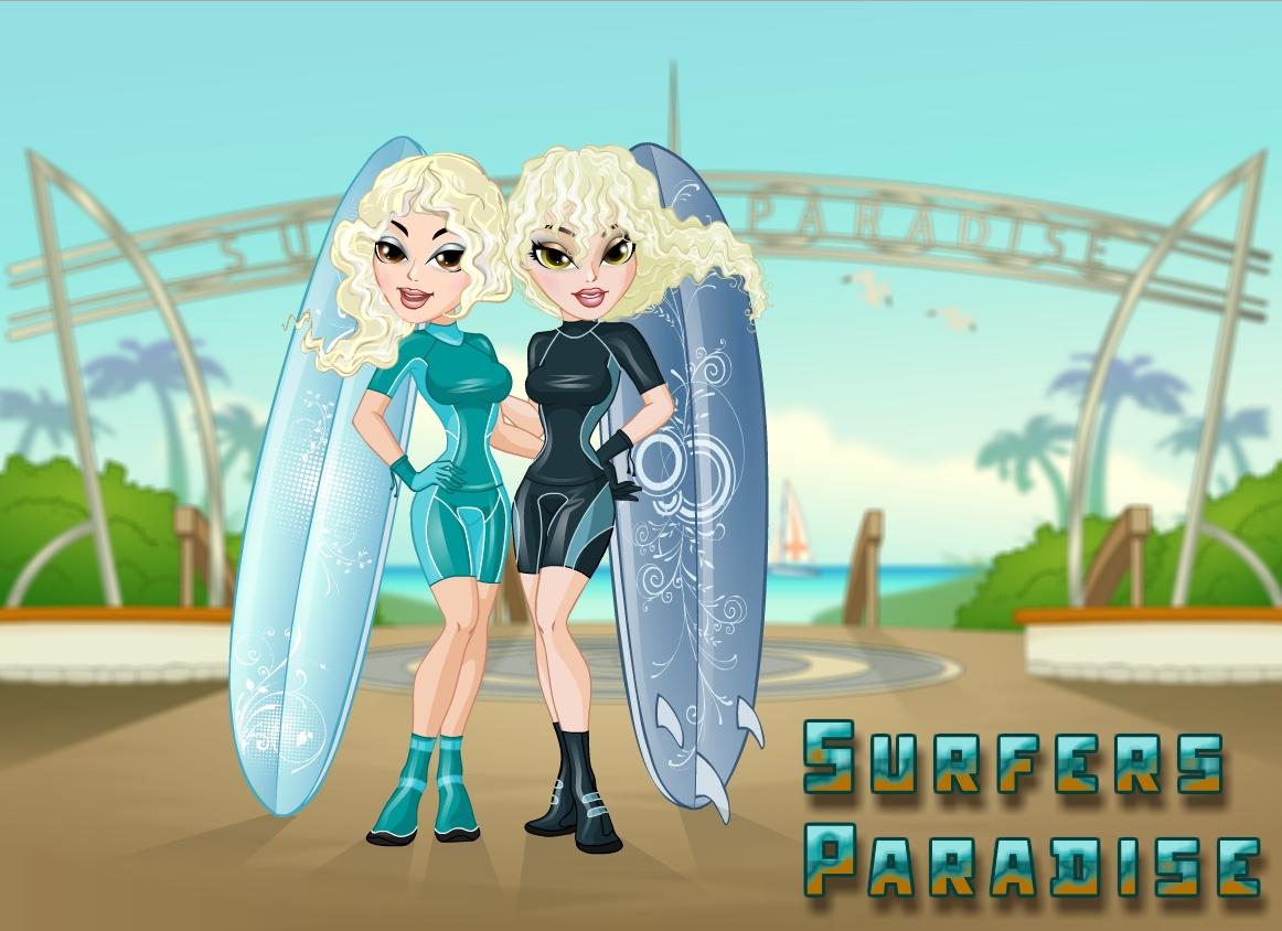 Dwie znajome surferki spotkały się nad morzem. Spraw, by dziewczyny podczas pływania na desce prezentowały się wyśmienicie.
