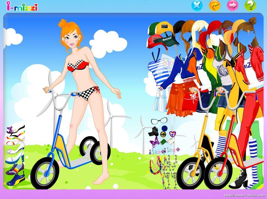 Dziewczyna jeździ na hulajnodze wśród wiatraków prądotwórczych. Musimy dobrać dla niej fajne ubrania, aby nie wyglądała zbyt przeciętnie.