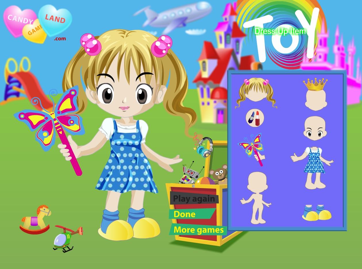 Dziewczynka przebywa w krainie zabawek. Chce ładnie wyglądać. Twoim zadaniem jest zapewnić jej odpowiednie ciuszki i dodatki.