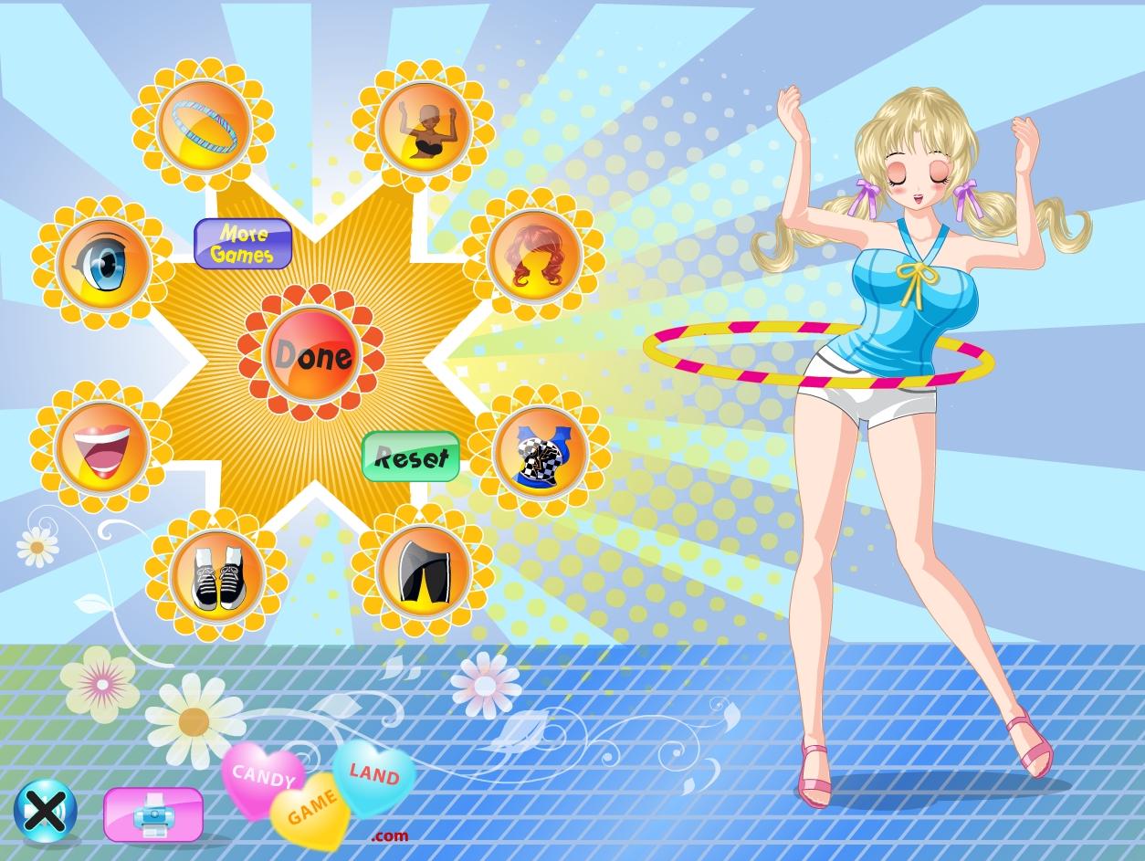 Dziewczyna bawi się obręczą hula hop. Twoim zadaniem jest dobrać dla niej odpowiednie ubrania do tego typu zabawy.