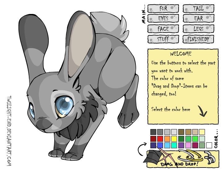 W tej ubierance możesz wykreować swojego króliczka. Od Ciebie zależy jego umaszczenie oraz znaki szczególne. Możesz dowolnie zmieniać poszczególne części jego ciała, tak aby się Tobie podobał.