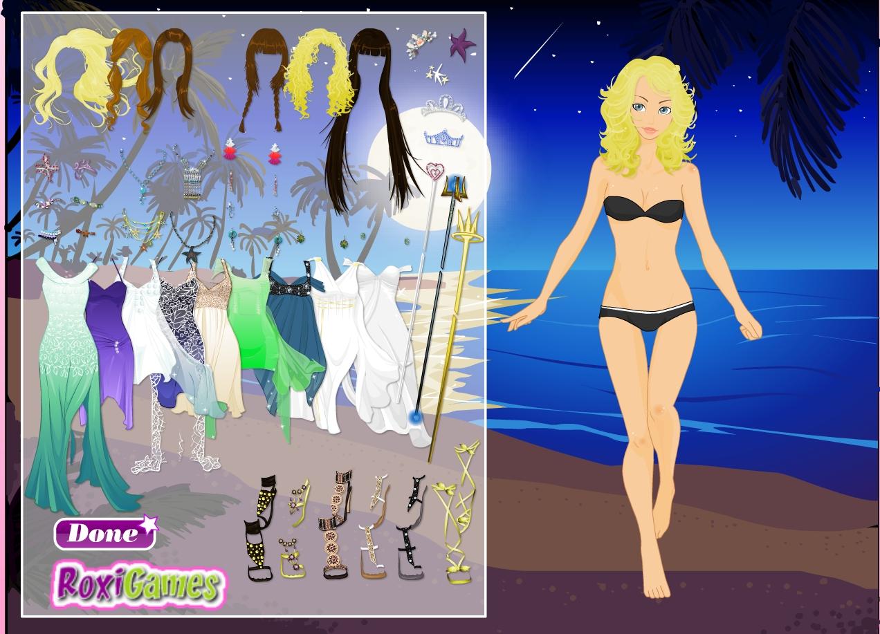 Nadmorski księżyc już pięknie lśni, zatem czas na nocny spacer w blasku księżyca. Kobieta jest bardzo chętna na taką wędrówkę, jedyne czego jej brak, to fajnego stroju. Wybierz coś dla niej.
