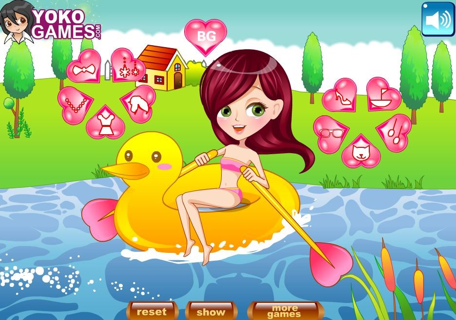 Dziewczyna spędza upalny dzień nad wodą, wylegując się na pontonie.. Jedyne czego jej brak fajnej stlyizajci, nowej fryzury i makijażu. Zadbaj o wygląd dziewczyny, by była piękna.