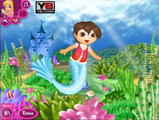 Mała dora wciela się w postac syrenki z bajek.. Pomóż jej upodobnić się do syrenki, wybierz dla niej idealne dekoracje i spraw, że Dora będzie zadowolona z Twojej pomocy.
