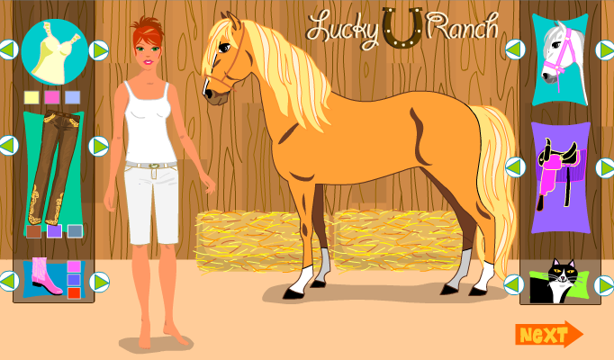 Młoda dżokejka zabiera swojego wybiera się już na jazdę. Twoim zadaniem będzie wybrać dla dziewczyny, jak i dla konia idealne stroje, które nadadzą się na wyprawę.