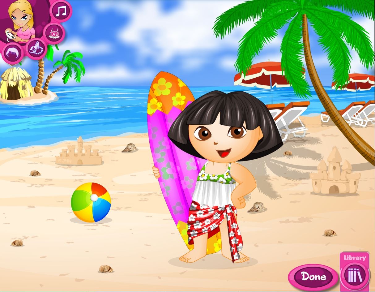 Dora korzysta z ostatnich chwil wakacji na Hawajach. Wyrusza na plażę, dlatego wybierz dla niej świetny strój kąpielowy oraz dodatki.
